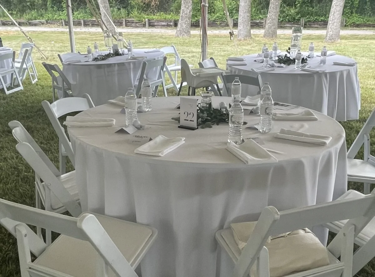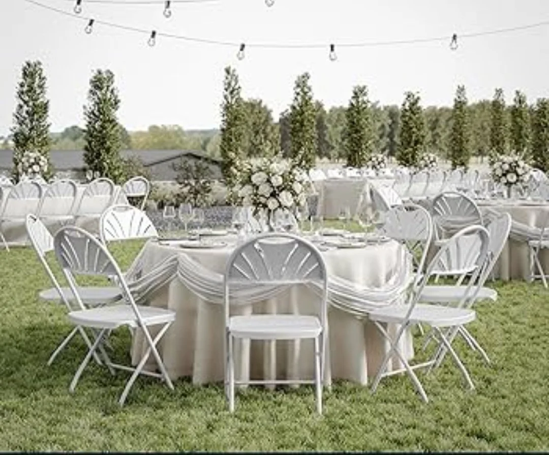 Seating includes standard heavy duty folding chairs, fan-back chairs and white resin padded chairs for a polished, comfortable look. Whether you’re planning a formal banquet, intimate couple seating, cocktail reception, or general seating area, our inventory provides versatile, clean, and durable options to match your layout and style.